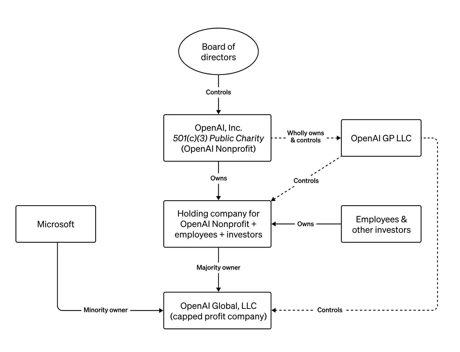 Previously Microsoft could claim 49% of profits but never exercised it because OpenAI wasn't profitable. Now it's a cleaner 27% equity stake. The org chart was already a mess of LLCs and holding companies - now it's even more complicated.