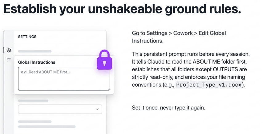 This is a persistent prompt Claude reads before every session. Set it once. Never type it again. Tell it to always read your ABOUT ME folder first, always check for relevant project files, always deliver to the CLAUDE OUTPUTS folder, and never delete anything.