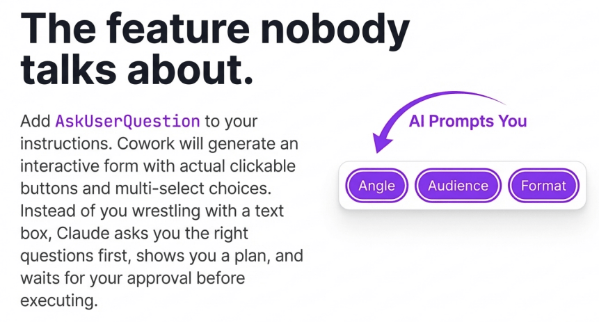 Claude generates a proper form with clickable options. Instead of you writing the perfect prompt, it asks YOU the right questions first. What's the angle? Who's the audience? How long? What tone?