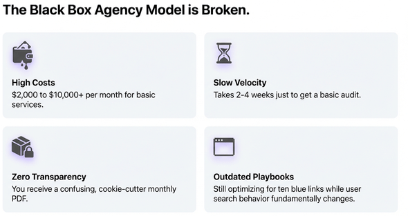 Here's what hiring an SEO agency used to look like. You'd pay a couple of thousand pounds a month - minimum. Tens of thousands if you're a bigger company. They'd spend the first month on an "audit" that probably took them a few hours. Then you'd be locked into a six to twelve month contract with very little visibility into what they're actually doing.