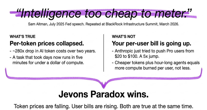 The "too cheap to meter" line was marketing, not maths. It was always going to be marketing. Your 2026 reality is that per-user bills are going up because you're using these tools 1000x more than you were two years ago.