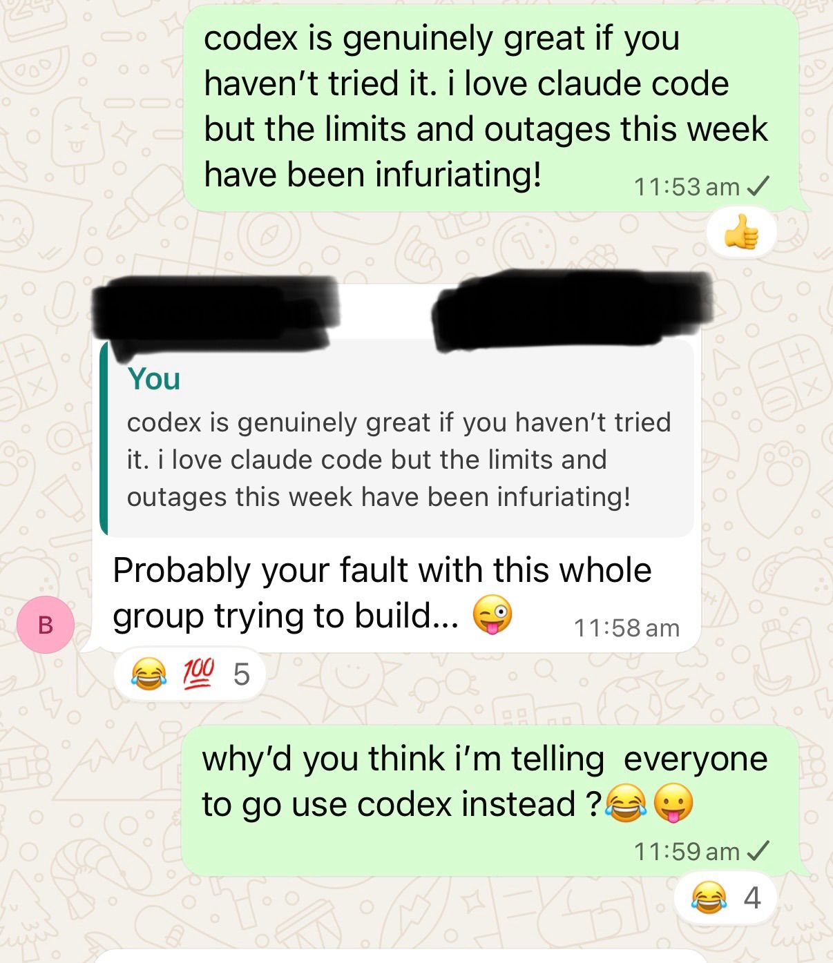 This isn’t sponsored by OpenAI. Hell, I’ve been relentlessly dumping on them for weeks… instead it’s a genuine suggestion that if you’ve become reliant on Claude Code and got frustrated with usage make sure to check up Codex as a backup.