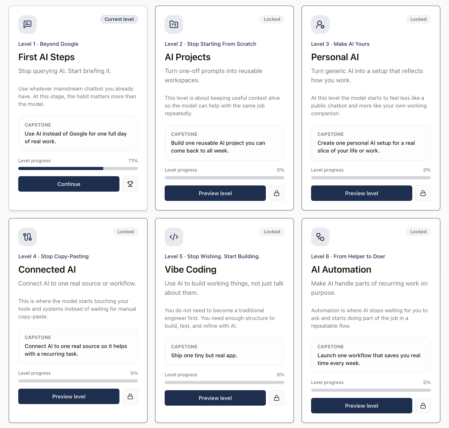 Next week’s emails will be connected to this tool as well - basically guiding you through the Levels of AI and helping you level up!